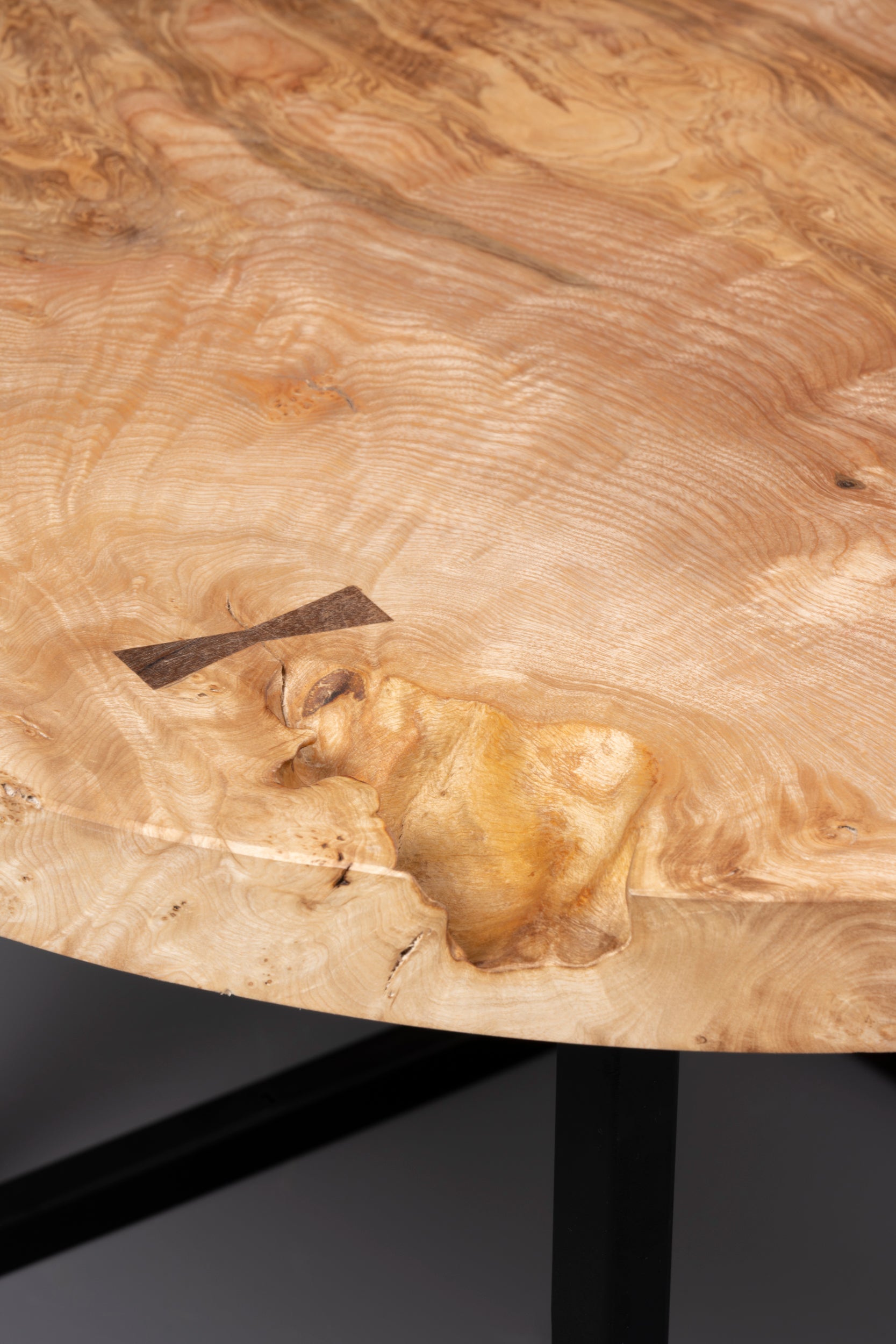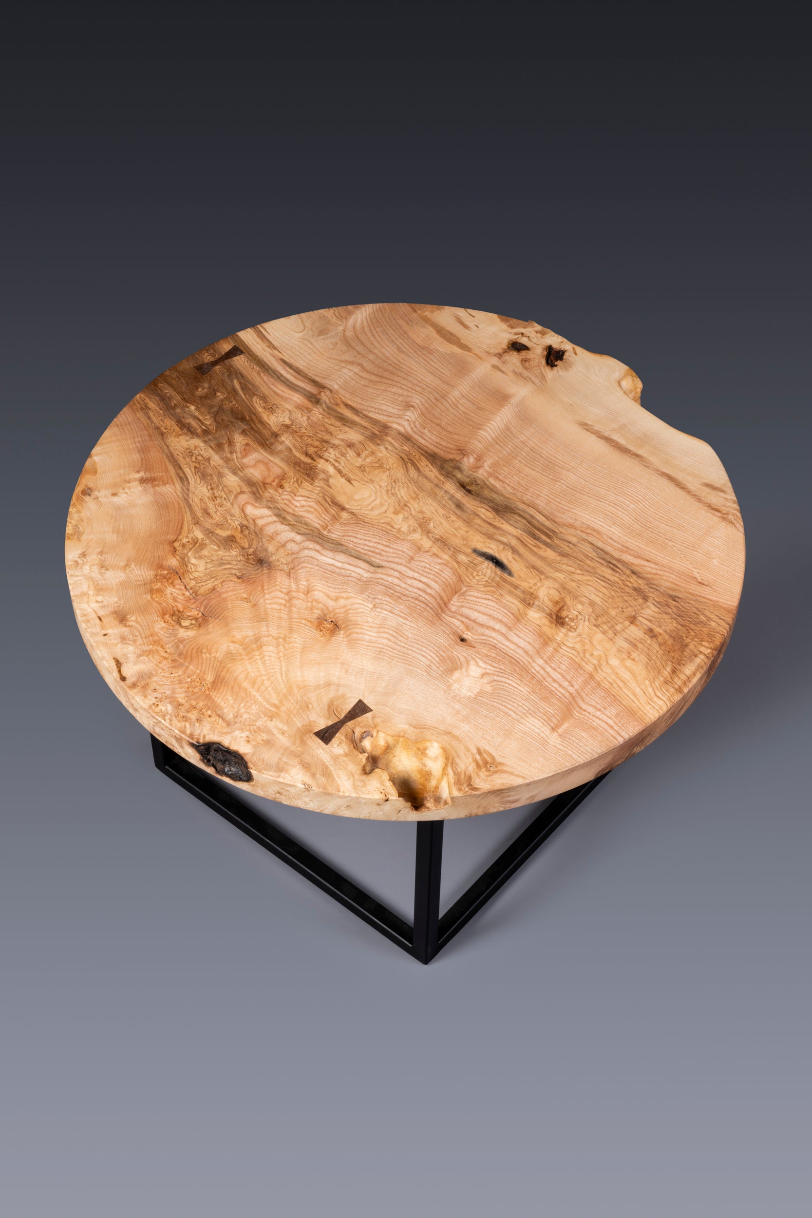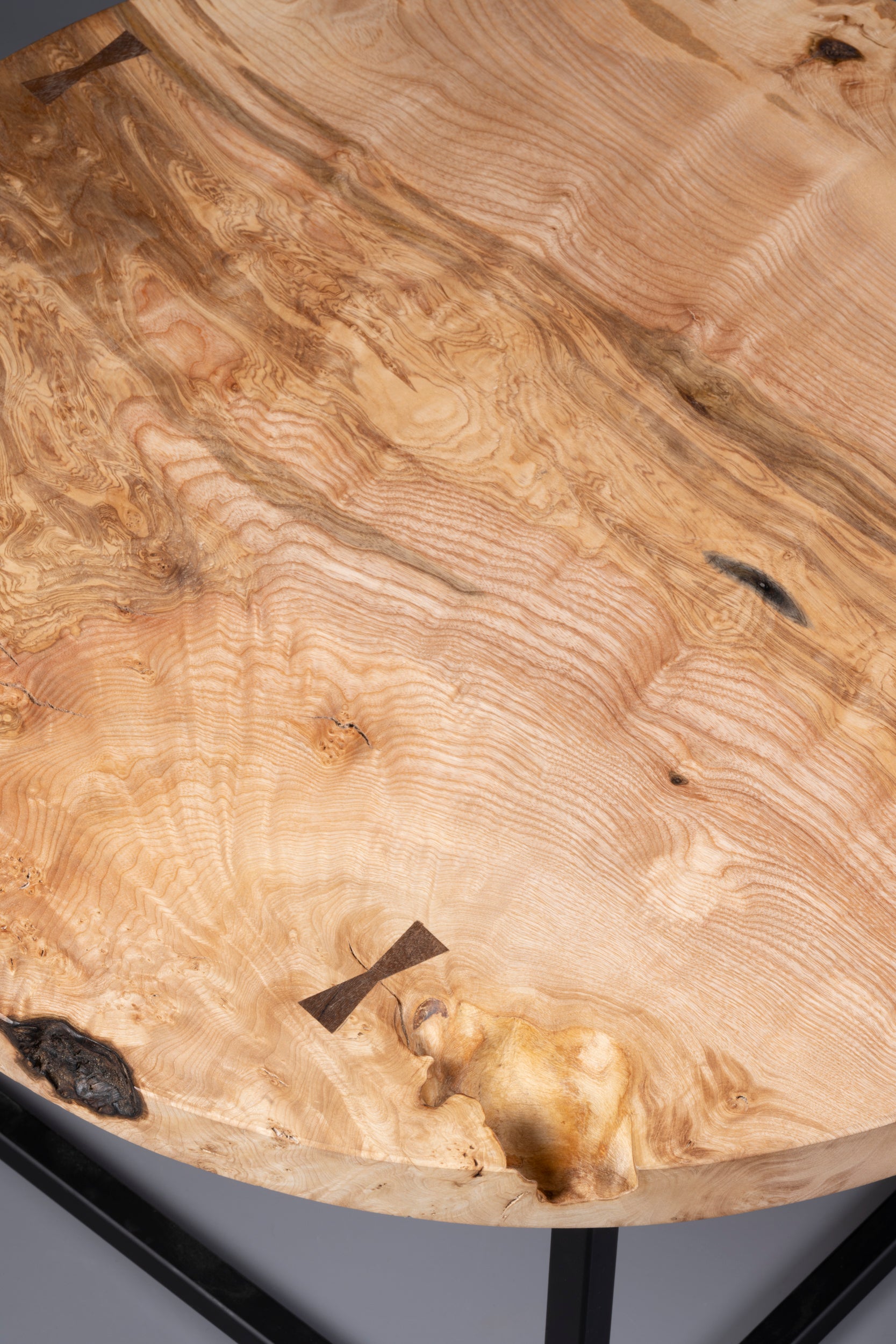 This one of a kind piece was made from one of the most incredible pieces of ash I have ever had the pleasure to work with. The flow of the grain and the colour variation through this slab are simply breathtaking. The table top is almost a perfect circle, with just a subtle hint of the live edge of the tree on two side. This organic touch brings so much to the finished piece.