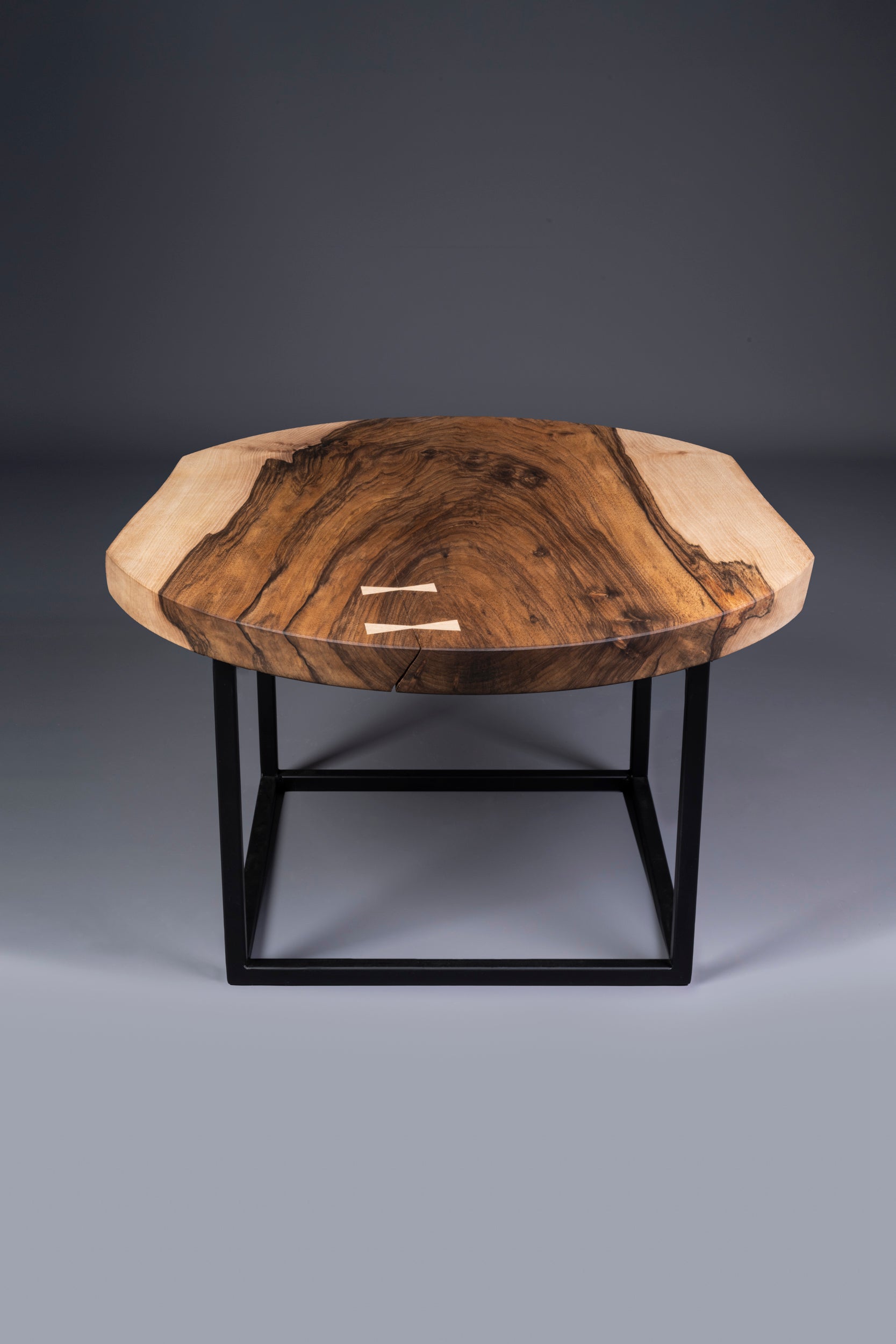 A long split in the slab has been stabilised using a pair of handcuff butterfly inlays, created from the pale sapwood from that borders the rich brown heart of the tree. This adds a subtle continuity, carrying some of the stunning pale wood into the centre of the piece.