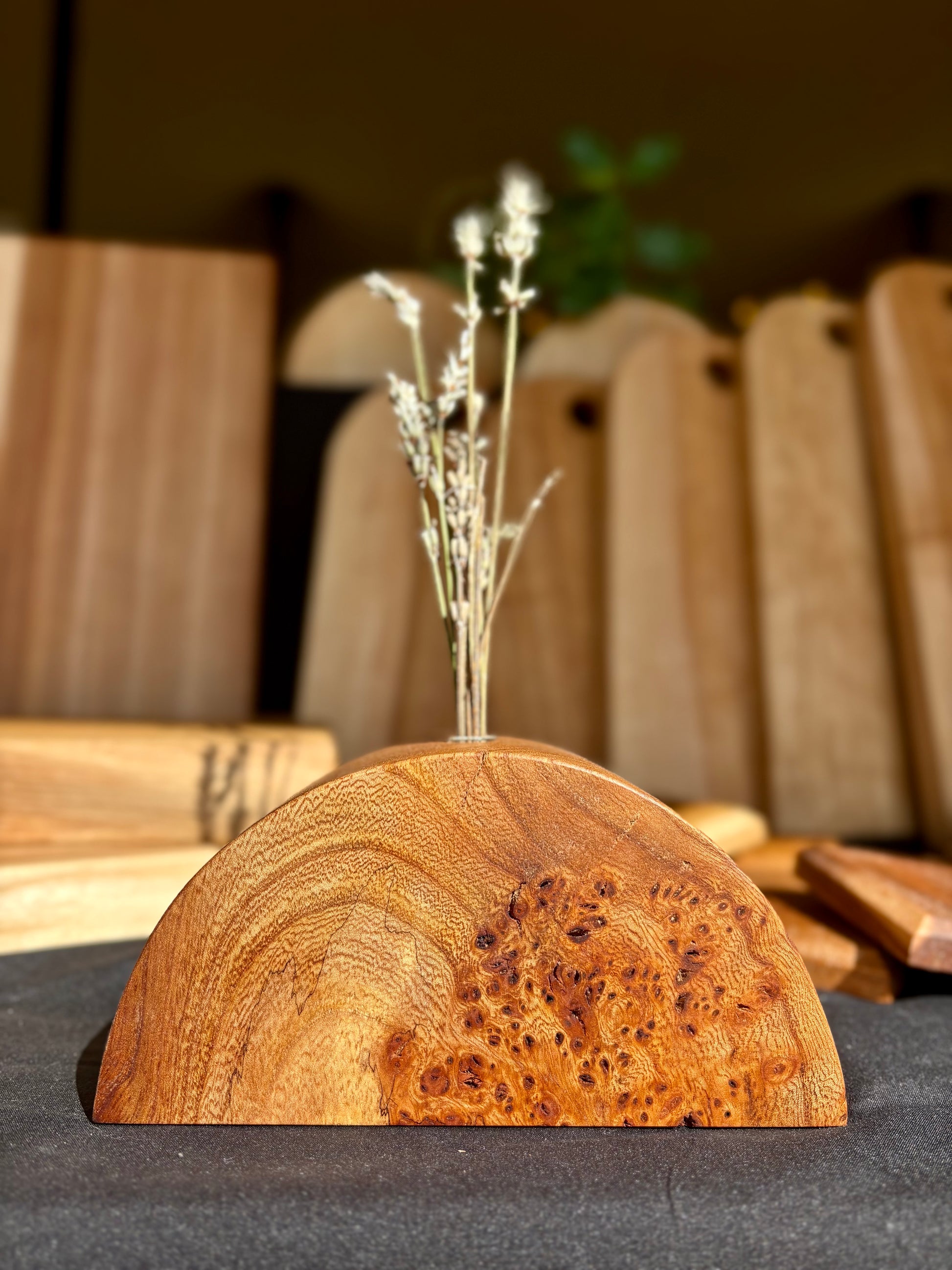A single stem flower will for snugly in the glass test tube that has been inserted into the centre of the wood allowing you too add water to nourish the plan within its new wooden home
